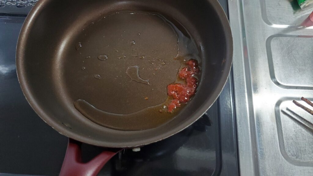 3.フライパンに油を入れ豆板醤小さじ1/2とにんにくチューブを2~3cm程度を入れ弱火から中火くらいで油で炒める 20秒ほどで香りが出始める
