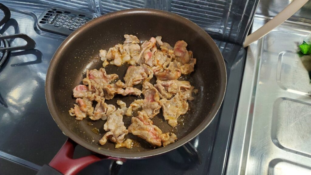4.20秒ほど経ったらお肉を投入し、中火で炒める