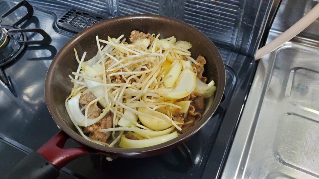 5.これくらい火が通ったら野菜を投入 水分飛ばしぎみがいいので少しだけ火を強める
