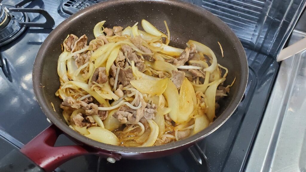 6.野菜に火が通ってきたら合わせたタレを投入